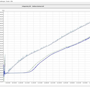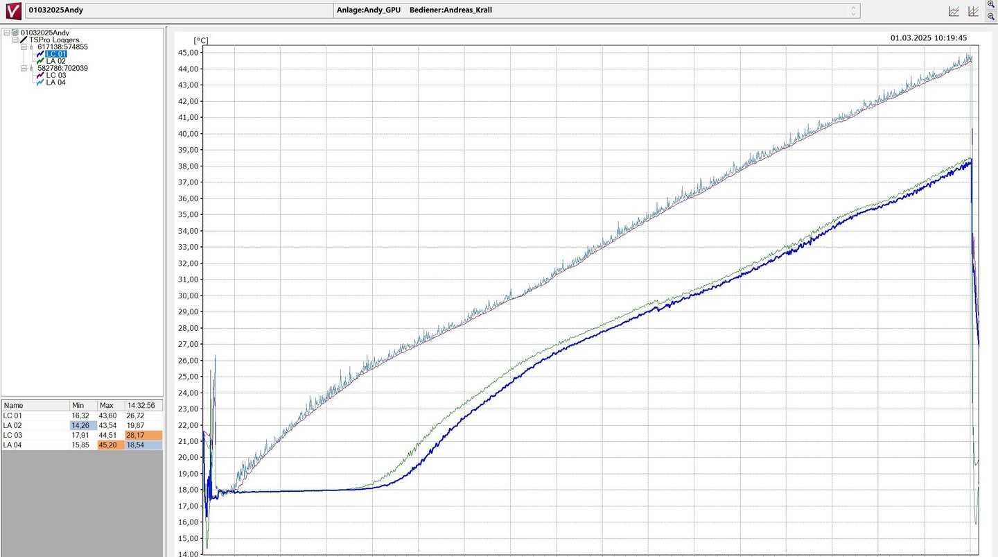 Aber ich muss nochmal zurück – zum 1. März 2025. Das war der Tag, an dem unsere Anlage ein 200-Liter-Fass in nur vier Stunden auf 45 Grad Celsius gebracht hat. Ohne irgendeine Isolierung. Einfach so. Im unteren Bereich lag die Temperatur immer noch bei 37 Grad. Und das war der Moment, in dem ich gemerkt habe: Das funktioniert wirklich.(Der Verlauf ist im unteren Bild zu sehen, falls ihr tiefer einsteigen wollt.)